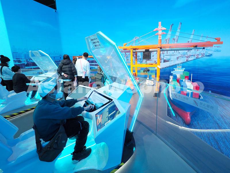 图片说明:2023年1月10日,中国科学技术馆,小朋友在体验5G港口控制系统。