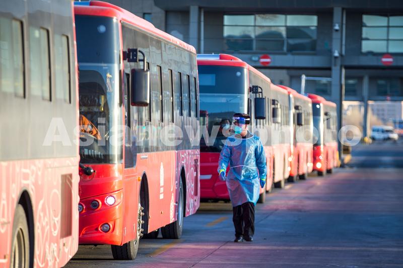 图片说明:2023年1月9日,二连出入境边防检查站执勤民警对出境公交车进行车体检查。