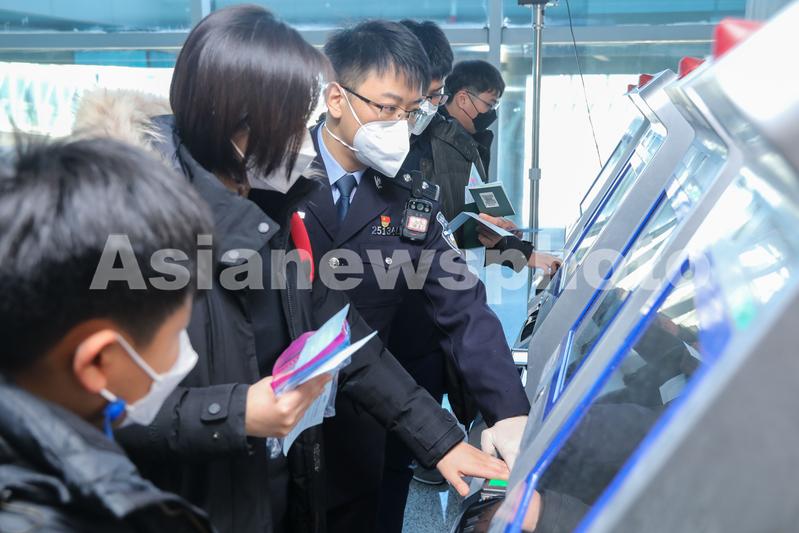 1月9日,山东出入境边防检查总站青岛机场边检站民警引导旅客采集入境通关信息。