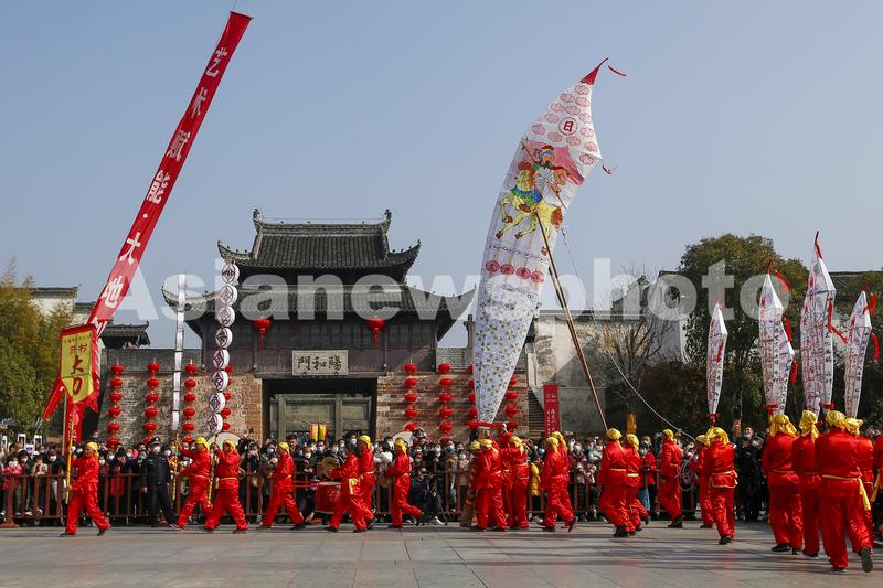 图片说明:2023年1月10日,在安徽省黄山市歙县徽州古城拍摄的民俗表演许村舞大刀。