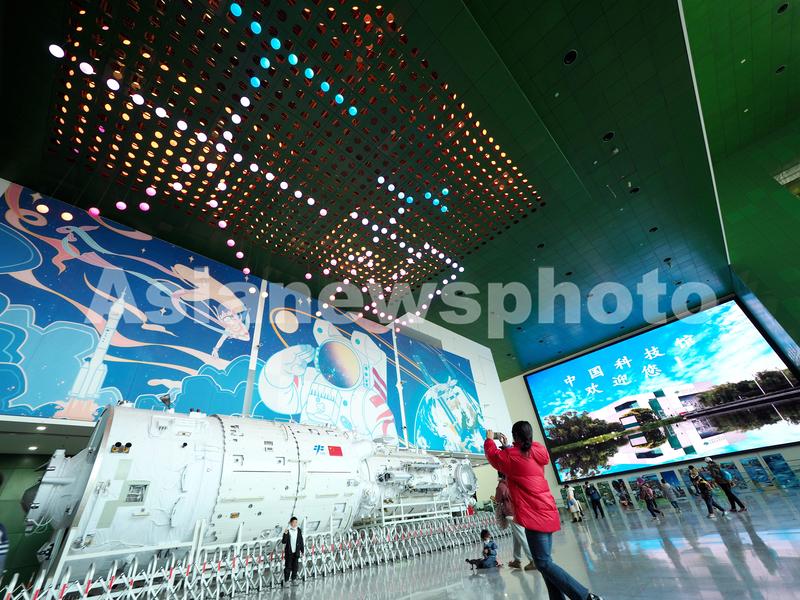 图片说明:2023年1月10日,中国科学技术馆,观众在参观天和号空间站模型。