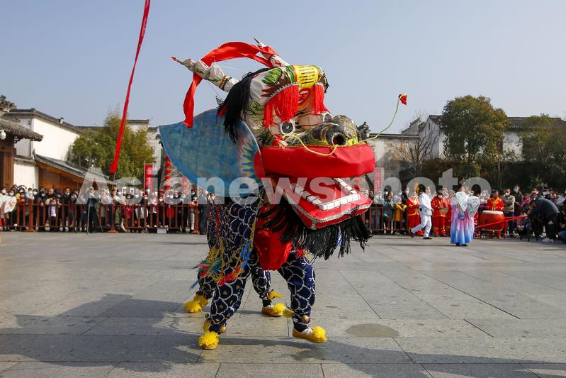 图片说明:2023年1月10日,在安徽省黄山市歙县徽州古城拍摄的民俗表演富堨麒麟舞。