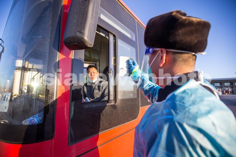 图片说明:2023年1月9日,二连出入境边防检查站执勤民警对司机进行人证对照。