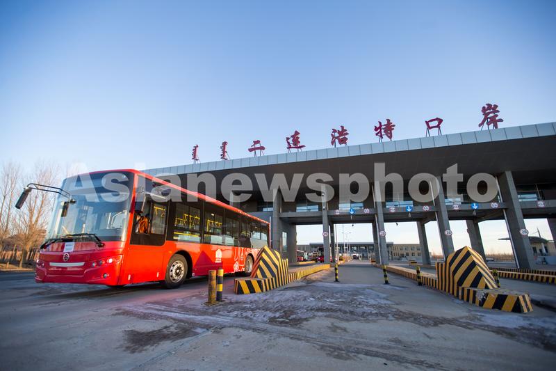 图片说明:2023年1月9日,出境公交车驶出二连浩特公路口岸。