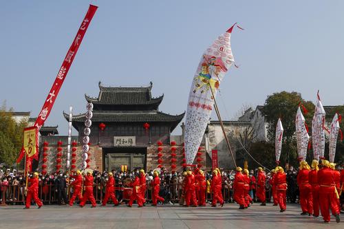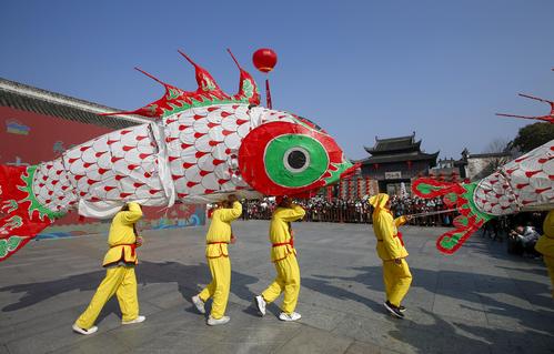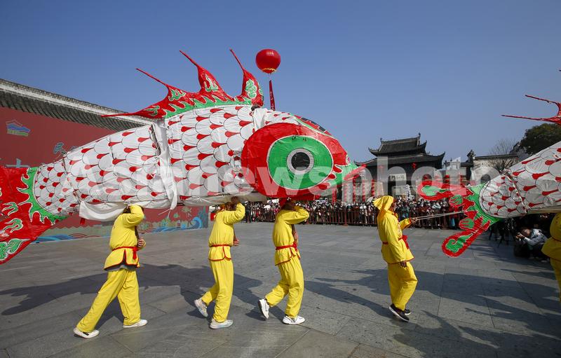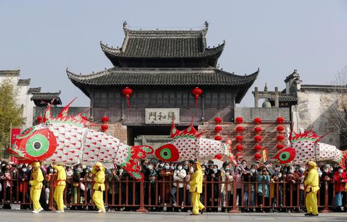 图片说明:2023年1月10日,在安徽省黄山市歙县徽州古城拍摄的民俗表演汪满田舞鱼灯。