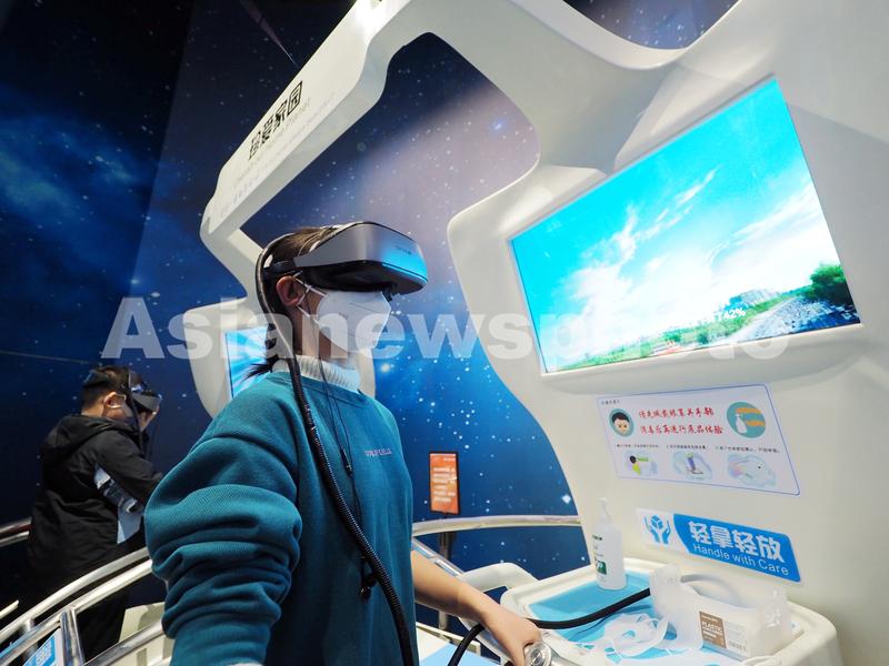 图片说明:2023年1月10日,中国科学技术馆,小朋友通过VR科技学习地球环保知识。