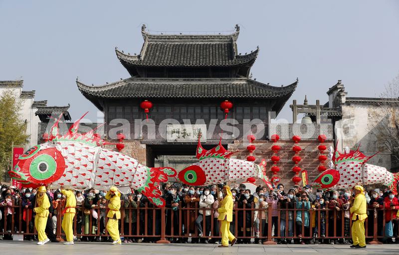 2023年1月10日,在安徽省黄山市歙县徽州古城拍摄的民俗表演汪满田舞鱼灯。