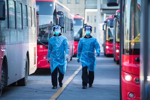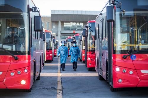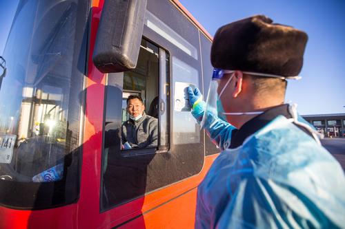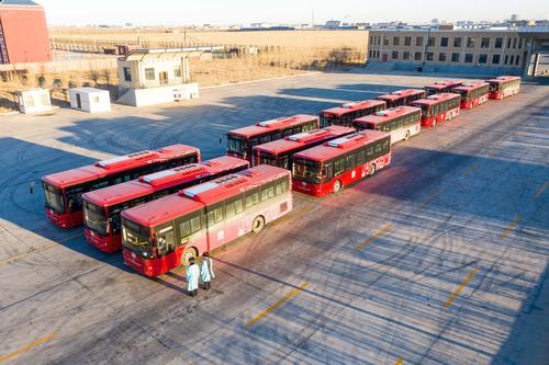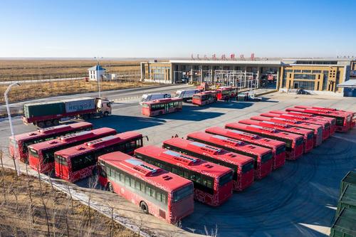 图片说明:2023年1月9日,二连浩特公路口岸等待出境的公交车辆。