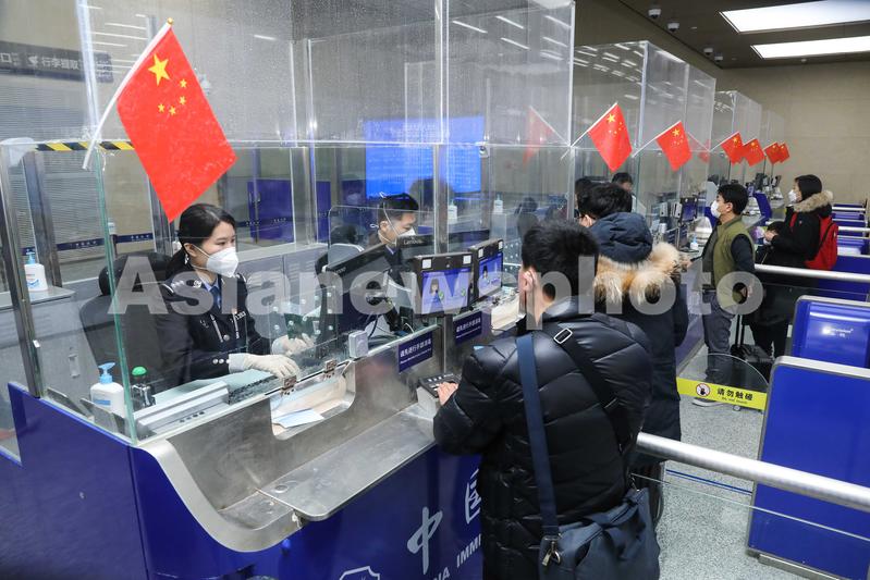 1月9日,山东出入境边防检查总站青岛机场边检站民警为入境旅客办理通关手续。
