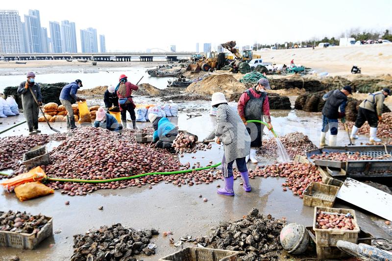 图片说明:2023年1月11日,山东青岛西海岸新区城市阳台海滨,养殖工人在分拣清洗成熟的扇贝。