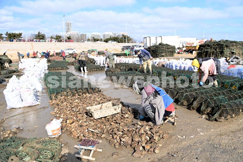图片说明:2023年1月11日,山东青岛西海岸新区城市阳台海滨,养殖工人在分拣成熟的牡蛎。