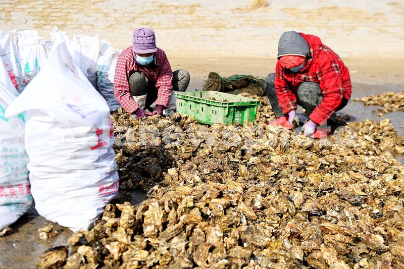 图片说明:2023年1月11日,山东青岛西海岸新区城市阳台海滨,养殖工人在分拣成熟的牡蛎。