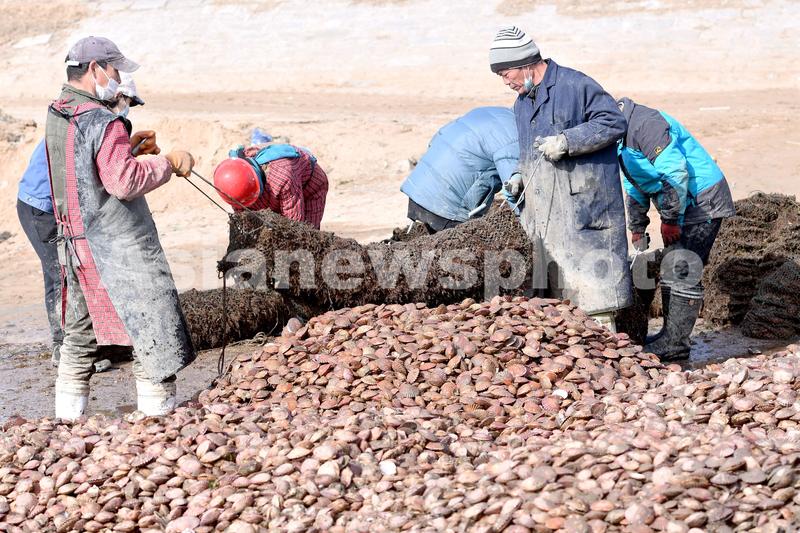 图片说明:2023年1月11日,山东青岛西海岸新区城市阳台海滨,养殖工人在倒出成熟的扇贝。