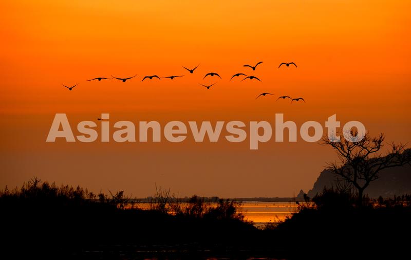 2023年1月11日清晨,山东省荣成市国家级自然保护区天鹅湖旭日东升,彩霞满天。在此栖息越冬的大天鹅迎着朝阳飞舞、追逐、欢歌,构成一幅和谐美丽的生态画面。