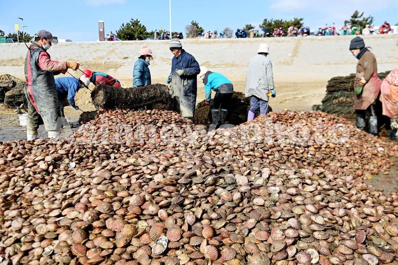 图片说明:2023年1月11日,山东青岛西海岸新区城市阳台海滨,养殖工人在倒出成熟的扇贝。