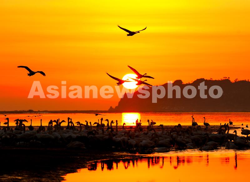 2023年1月11日清晨,山东省荣成市国家级自然保护区天鹅湖旭日东升,彩霞满天。在此栖息越冬的大天鹅迎着朝阳飞舞、追逐、欢歌,构成一幅和谐美丽的生态画面。