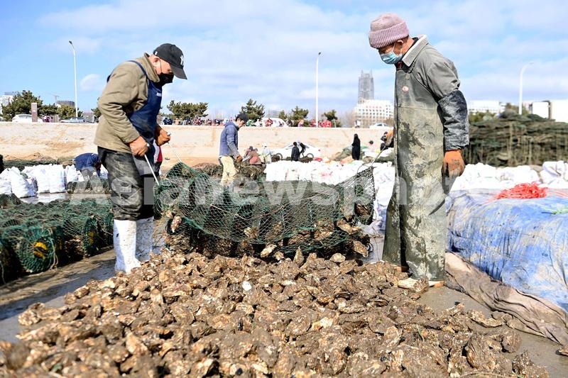 图片说明:2023年1月11日,山东青岛西海岸新区城市阳台海滨,养殖工人在倒出成熟的牡蛎。