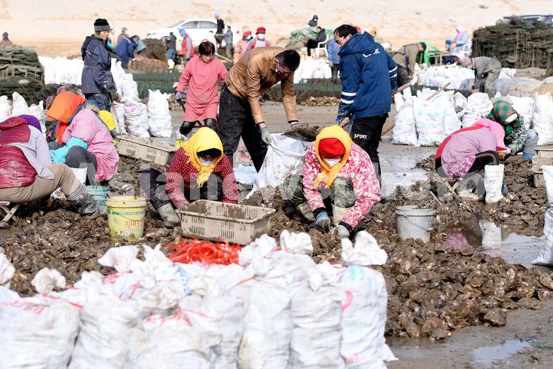 图片说明:2023年1月11日,山东青岛西海岸新区城市阳台海滨,养殖工人在分拣成熟的牡蛎。