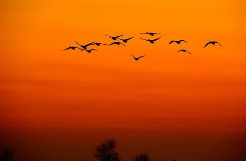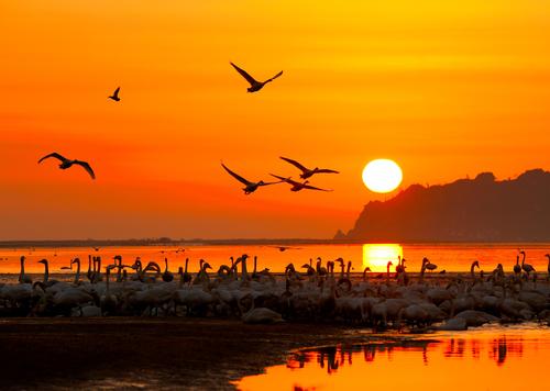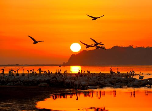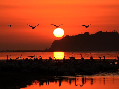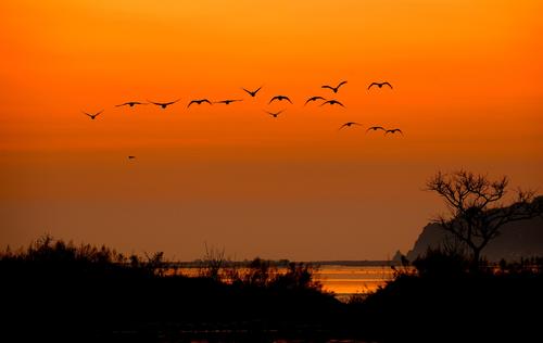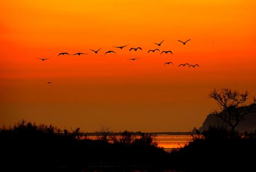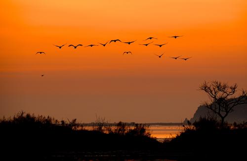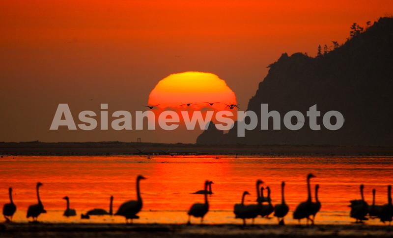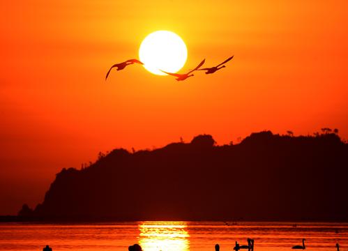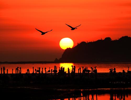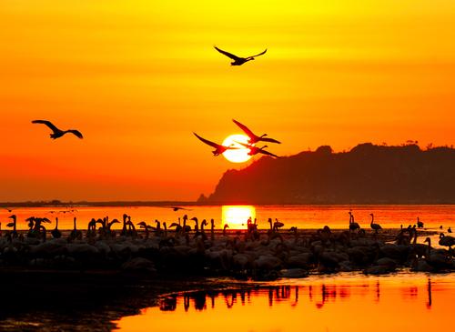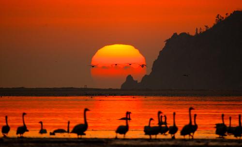 2023年1月11日清晨,山东省荣成市国家级自然保护区天鹅湖旭日东升,彩霞满天。在此栖息越冬的大天鹅迎着朝阳飞舞、追逐、欢歌,构成一幅和谐美丽的生态画面。