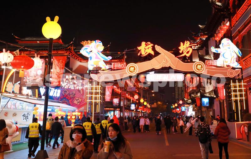 2023年1月7日,上海,老城厢旧校场路的集装箱夜市热闹红火,道路两旁的兔耳朵路灯充满趣味和年味。