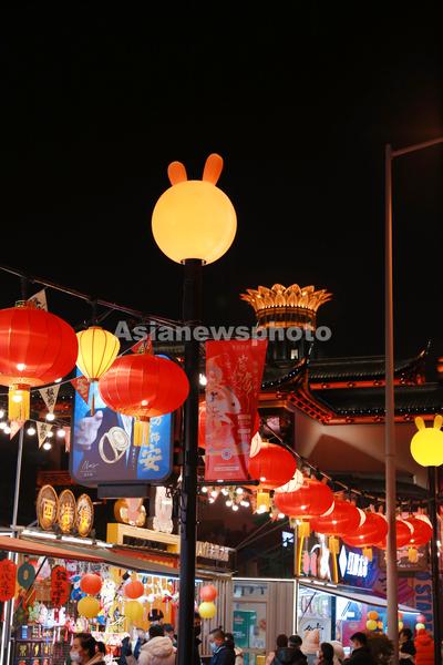 2023年1月7日,上海,老城厢旧校场路的集装箱夜市热闹红火,道路两旁的兔耳朵路灯充满趣味和年味。