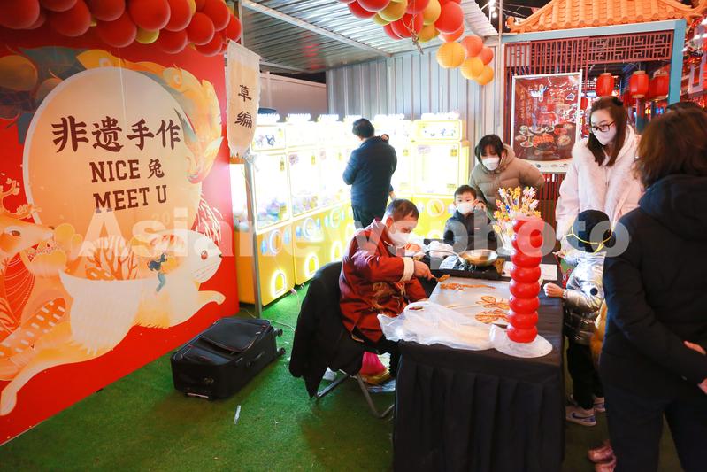 2023年1月7日,上海,老城厢旧校场路的集装箱夜市热闹红火,图为民间艺人的非遗手作糖画美食摊位。