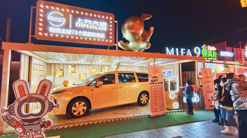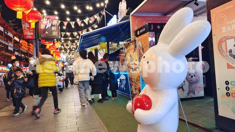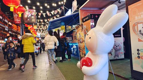 2023年1月7日,上海,老城厢旧校场路的集装箱夜市热闹红火,图为入口的兔子雕塑欢迎游客。