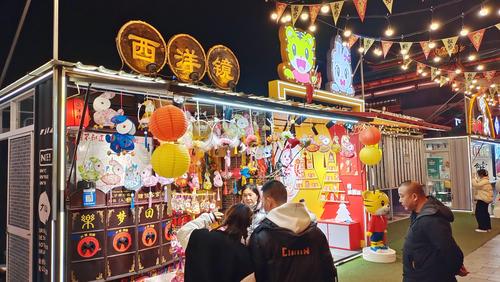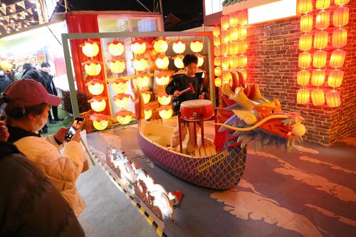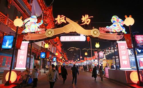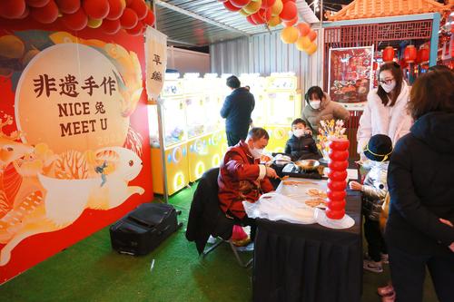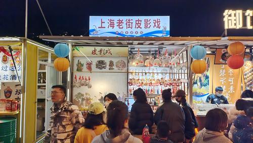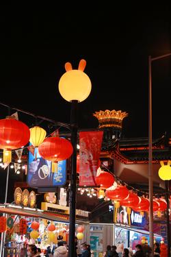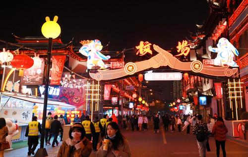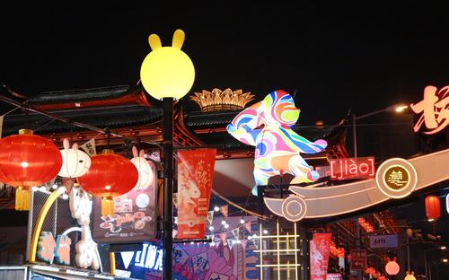 2023年1月7日,上海,老城厢旧校场路的集装箱夜市热闹红火,道路两旁的兔耳朵路灯充满趣味和年味。众多摆出兔子相关商品的国潮店铺沿袭古代“校场比武”传统,在这个明代驻兵演武之地打擂。