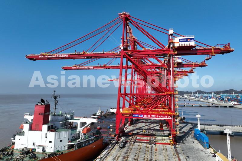2023年1月12日中午,宁波舟山港金塘港区大浦口集装箱码头5号泊位,一台起升高度52米、前伸距70米、可满足目前全球最大集装箱船舶远控作业的桥吊,从 “振华32”运输船缓慢移动、顺利上岸。至此,甬舟公司为大浦口集装箱码头规划配置的22台桥吊也全部到位。