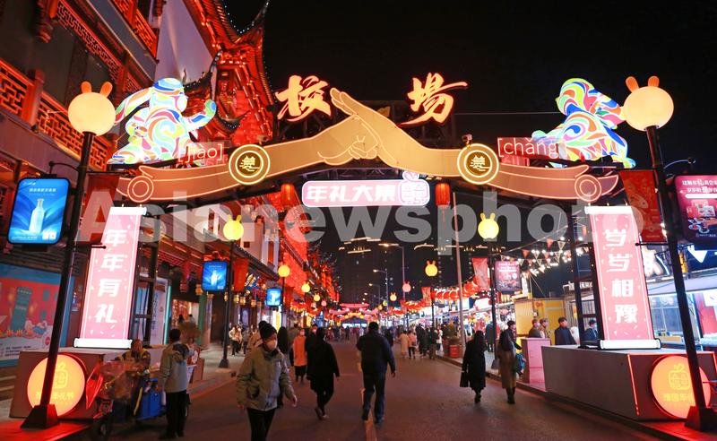 2023年1月7日,上海,老城厢旧校场路的集装箱夜市热闹红火,道路两旁的兔耳朵路灯充满趣味和年味。