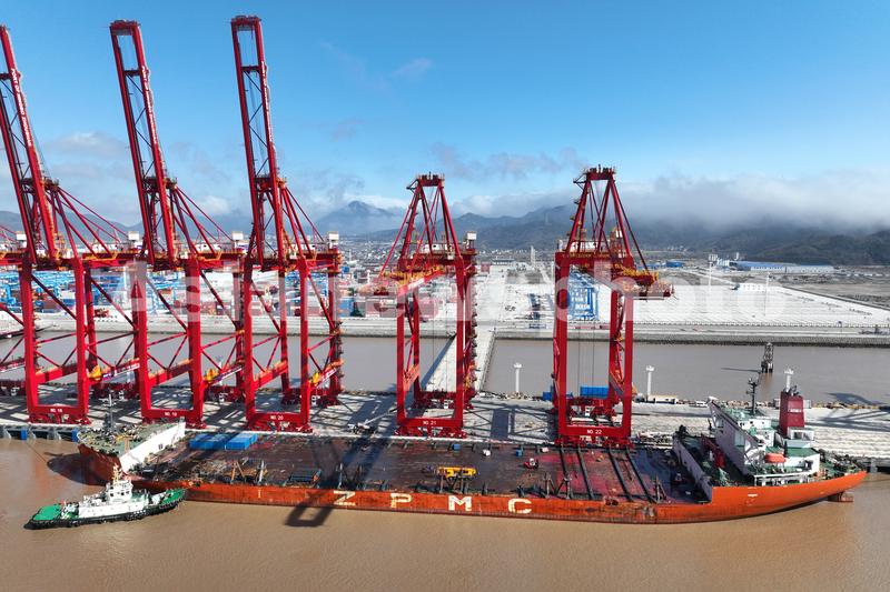 2023年1月12日中午,宁波舟山港金塘港区大浦口集装箱码头5号泊位,一台起升高度52米、前伸距70米、可满足目前全球最大集装箱船舶远控作业的桥吊,从 “振华32”运输船缓慢移动、顺利上岸。至此,甬舟公司为大浦口集装箱码头规划配置的22台桥吊也全部到位。