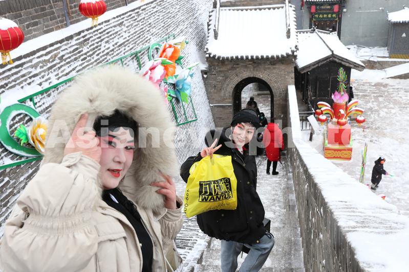 图片说明:参加完“平遥中国年”活动的演员准备离开,在古城墙上留影。