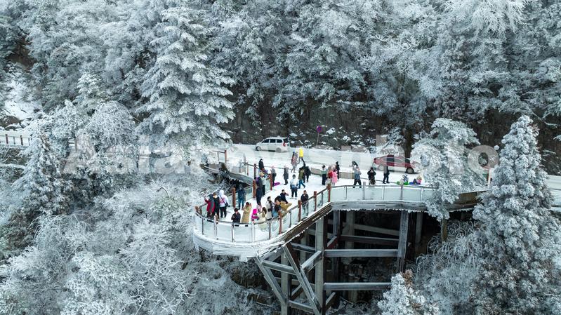 2023年1月16日,航拍江西庐山雪后初霁,银装素裹,大雪过后的庐山雾凇雪凇摇曳生姿,宛若人间仙境,吸引了不少游客前来欣赏雪景。