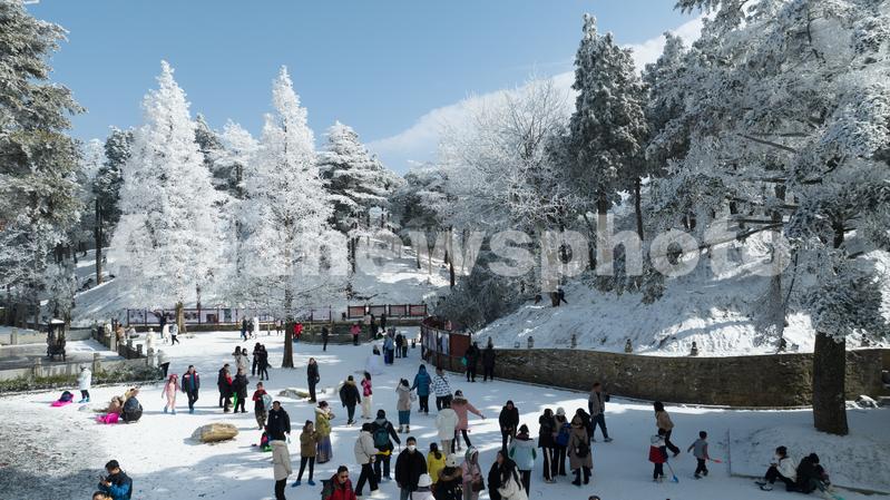 2023年1月16日,航拍江西庐山雪后初霁,银装素裹,大雪过后的庐山雾凇雪凇摇曳生姿,宛若人间仙境,吸引了不少游客前来欣赏雪景。