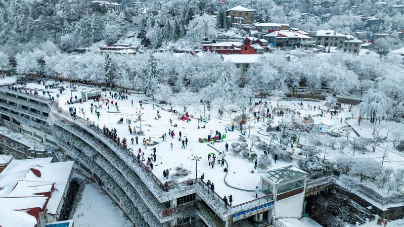 2023年1月16日,航拍江西庐山雪后初霁,银装素裹,大雪过后的庐山雾凇雪凇摇曳生姿,宛若人间仙境,吸引了不少游客前来欣赏雪景。