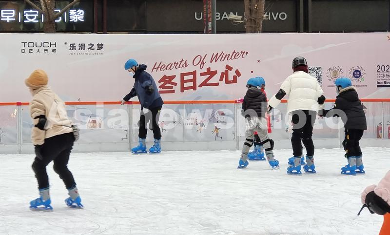 2023年1月15日,上海,寒潮降温下雪让魔都迎来最冷冬天,但市民在户外冰场滑冰的热情依然处于升温状态,正大乐城购物中心广场新年的冰雪游乐园人气火热,延续了北京冬奥会带动全民健身冰雪运动的影响力,特别在春节前疫情防控措施调整的新形势下,很多家长带着小孩穿着厚厚的羽绒服,在寒冷的冬季享受体育锻炼的乐趣。