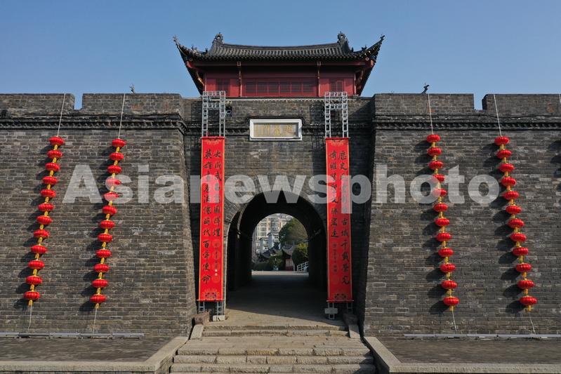 这是1月18日拍摄的武汉武昌起义门春联景观(无人机照片)。