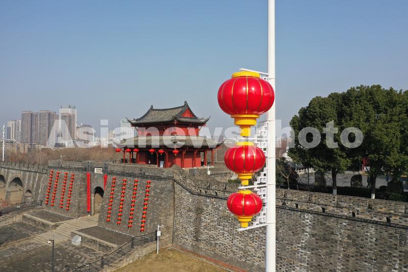 这是1月18日拍摄的武汉武昌起义门春联景观(无人机照片)。