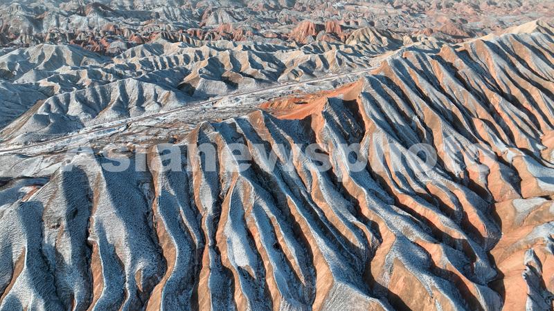 2023年1月19日,雪霁初晴的甘肃省张掖七彩丹霞景区,在晨光照耀下,丹山沟壑明暗鲜明、韵律奇妙、唯美如画。