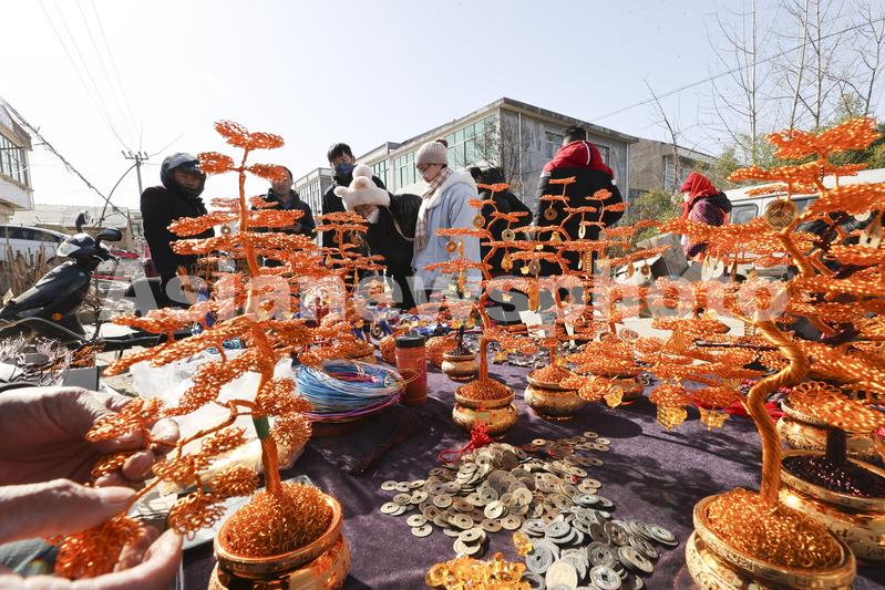 图片说明:2023年1月20日,一名民间艺人在江苏省连云港市赣榆区城头镇年集上制作发财树。