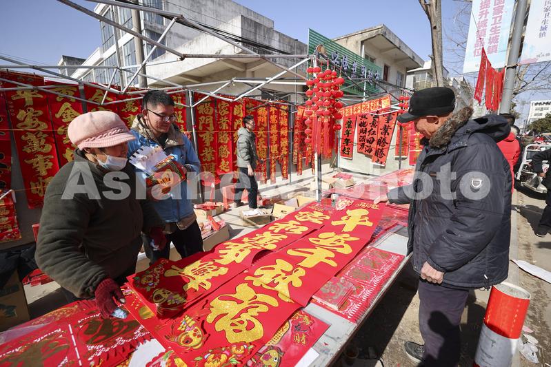 图片说明:2023年1月20日,人们在江苏省连云港市赣榆区城头镇年集上选购对联。