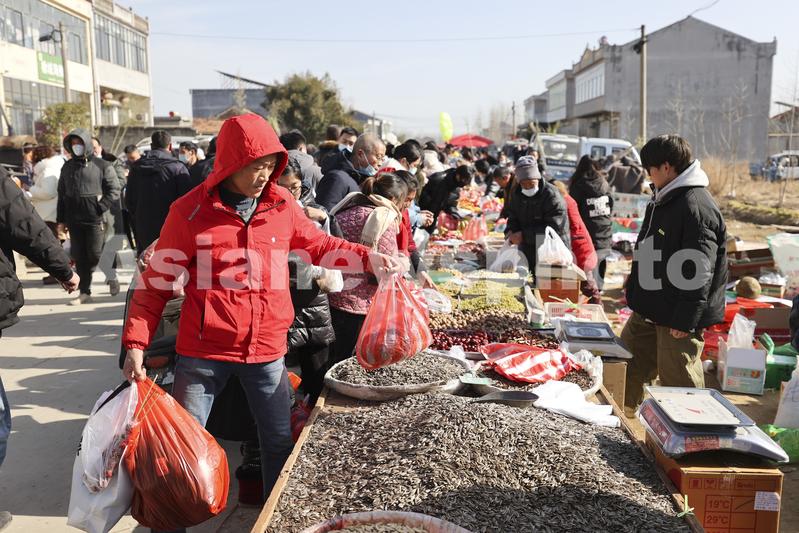 图片说明:2023年1月20日,人们在江苏省连云港市赣榆区城头镇年集上选购干果。