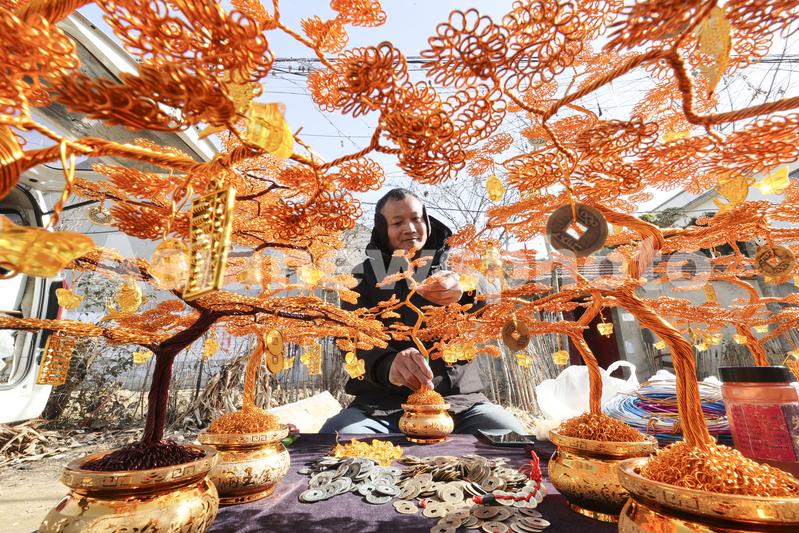 图片说明:2023年1月20日,一名民间艺人在江苏省连云港市赣榆区城头镇年集上制作发财树。