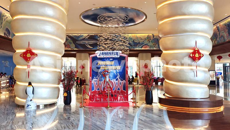 图片说明:2023年1月20日,上海,全国首个奥特曼主题酒店落户海昌海洋公园,酒店大堂内的奥特曼雕塑欢迎四方游客。