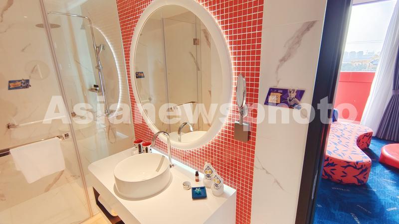 图片说明:2023年1月20日,上海,全国首个奥特曼主题酒店落户海昌海洋公园,全球首创IP盲盒式客房内的卫生间,各种毛巾、杯具上都是奥特曼IP造型图案。