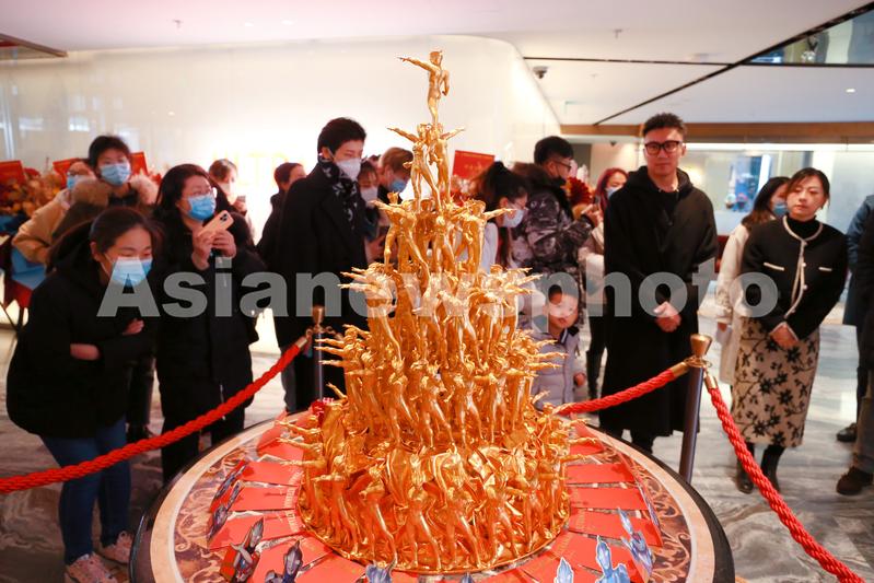 图片说明:2023年1月20日,上海,全国首个奥特曼主题酒店落户海昌海洋公园,中西合璧类似“十二铜人”造型的叠罗汉雕塑吸引游客眼球。