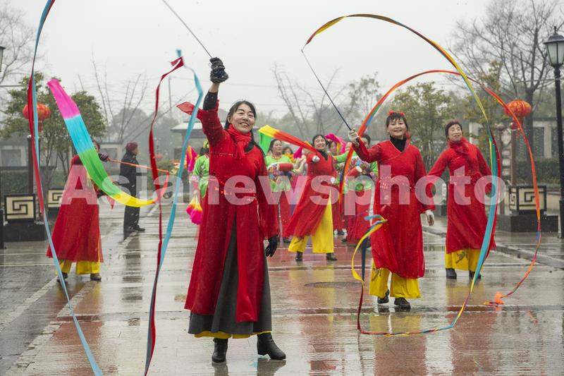 2023年1月22日,在江苏省海安市曲塘镇,民间艺人表演当地民俗舞蹈彩旗舞。