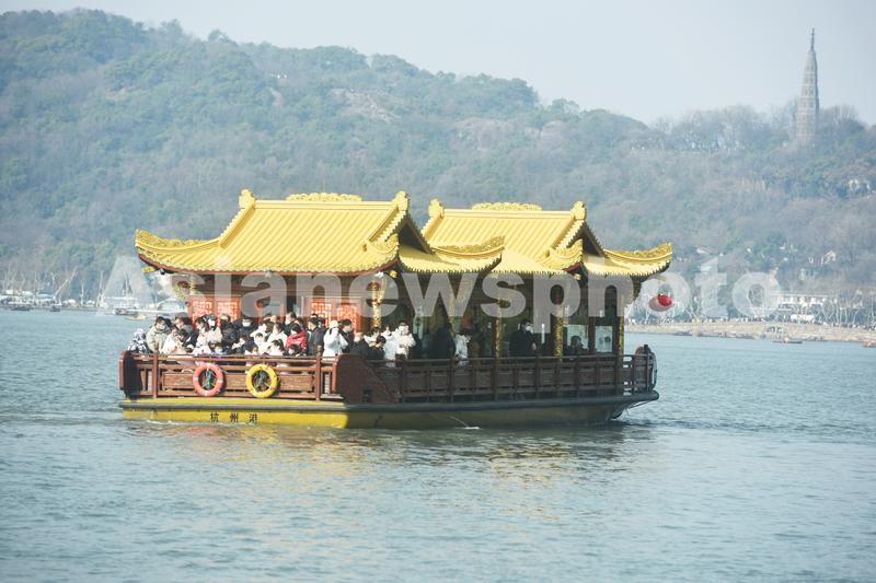 图片说明:2023年1月25日,游客乘坐画舫在杭州西湖上游览。