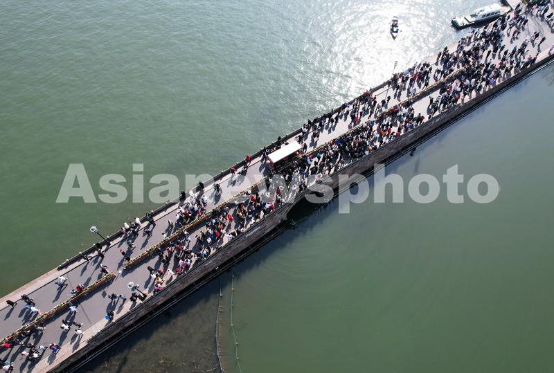 图片说明:2023年1月25日,从空中俯瞰杭州西湖断桥上的人潮。