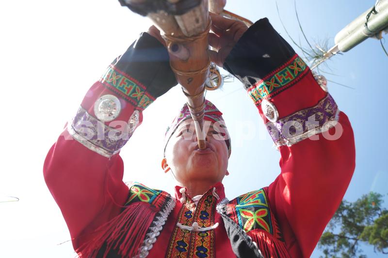图片说明:2023年1月27日,在广西融水苗族自治县安太乡元宝苗寨,来自大东江壮寨的一位壮族村民吹奏大芦笙。